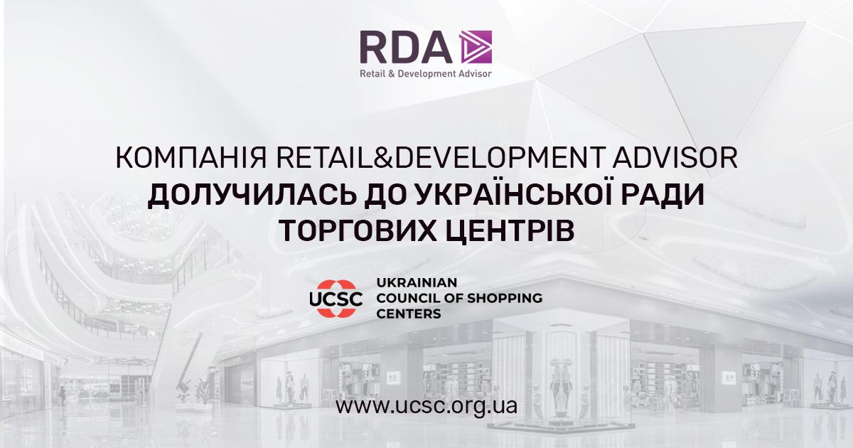 Компанія Retail&Development Advisor (RDA) офіційно стала учасником Української Ради Торгових Центрів (UCSC) — провідної галузевої асоціації, що об’єднує девелоперів, орендодавців, рітейлерів та інших учасників ринку комерційної нерухомості.