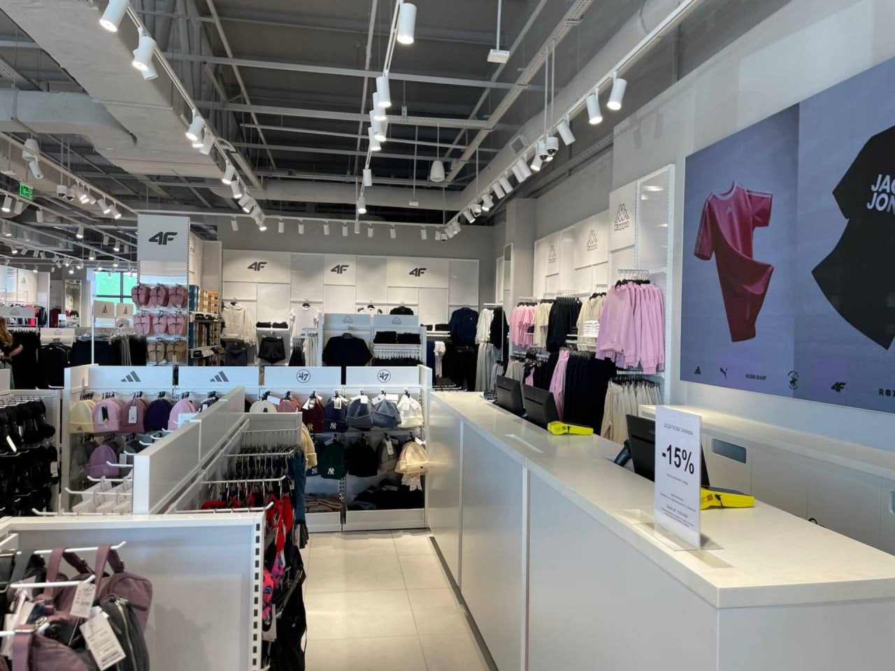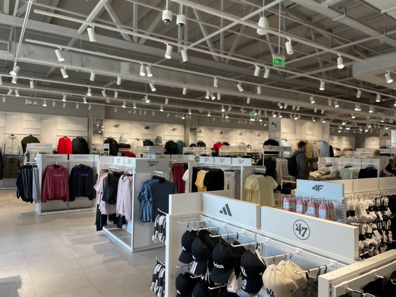 Серед представлених у магазині брендів — Adidas, Guess Jeans, Tom Tailor, Reebok, Champion та Puma.